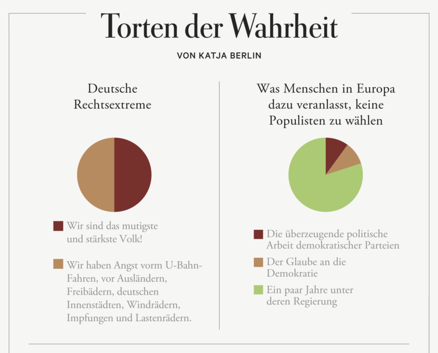 Natürlich wird nicht jeder, der eine autoritäre Kindheit hatte, automatisch zum Rechts- oder Linkspopulisten. Aber wer populistisch denkt, hat mit relativ hoher Wahrscheinlichkeit als Kind ein Weltbild erfahren, das eher durch Misstrauen als durch Vertrauen geprägt war. Jeder von uns verortet sich in seinem Leben durch biografische Erfahrungen auf einem Haltungsspektrum zwischen «Ist gut, ich kann vertrauen, die Menschen sind in Ordnung!» auf der einen Seite, und der Haltung «Ne, die Menschen sind nicht in Ordnung. Ich habe Angst. Ich brauche ein ordnendes Prinzip!» auf der anderen Seite. Wo auf der Linie zwischen diesen Polen wir uns befinden, hängt vor allem daran, wie wir selbst als Kinder Beziehungen erlebt haben.