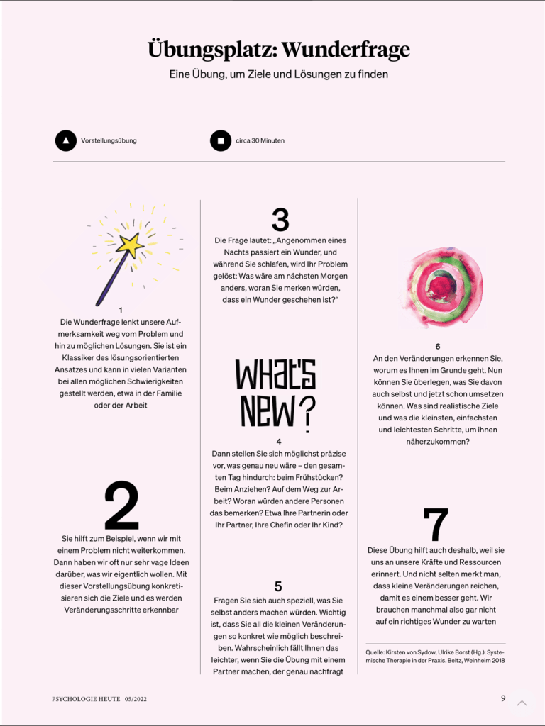 Das sind Versuche, durch neue Perspektiven auch neue Möglichkeiten für Veränderungen anzuregen. Diese Fragen bringen nicht nur mir ein vollständigeres Bild, vor allem die Klientin bekommt einen Anstoss, nimmt unerwartete Blickwinkel ein, sieht vielleicht Einflüsse, die ihr vorher gar nicht aufgefallen waren.