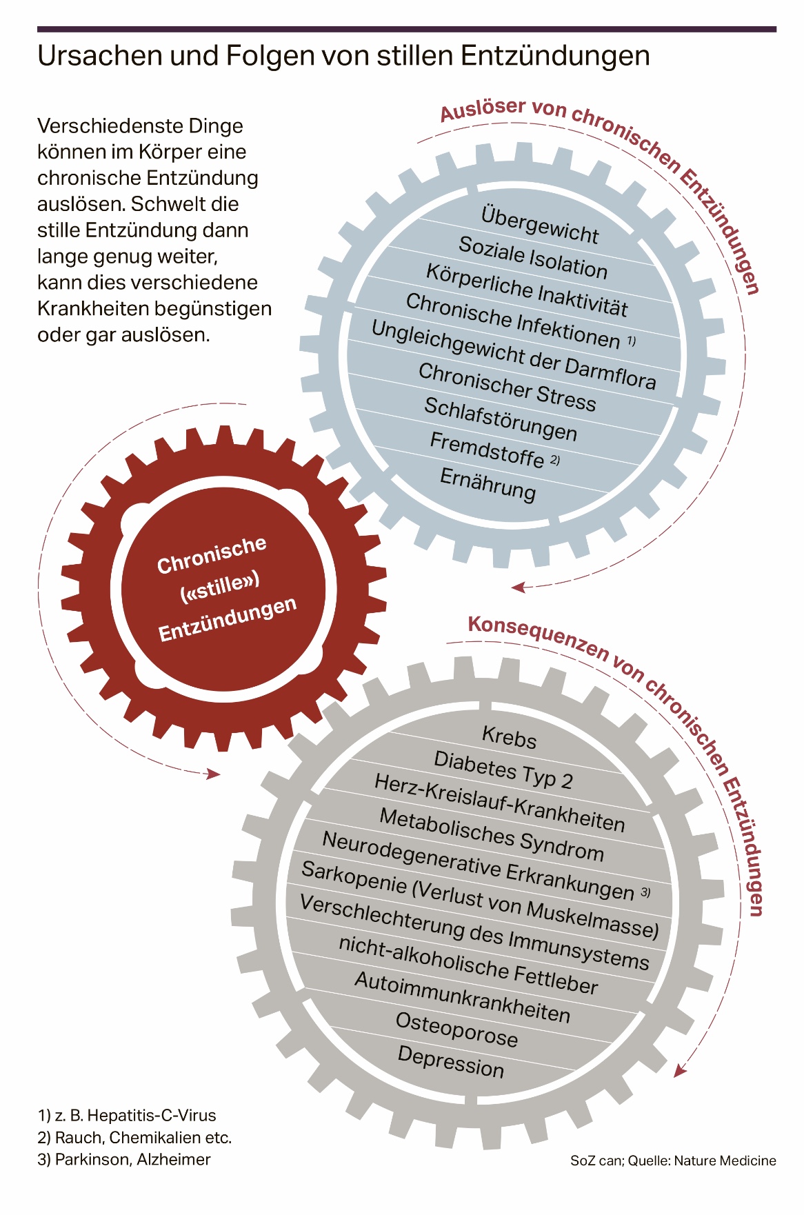 In den vergangenen Jahren hat die Medizin erkannt, dass viele Erkrankungen eine mehr oder weniger ausgeprägte Entzündungskomponente haben. Das gilt selbst für Krankheiten wie Atherosklerose, Darmkrebs oder neurologische Erkrankungen. Die Gerontologie betrachtet chronische Entzündungen inzwischen selbst als zentralen Mechanismus des Alterns. Dieser Zusammenhang wird als Inflammaging bezeichnet.