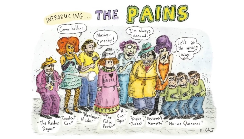 all pain, no gain! Das typische an PAINS sind lange Listen von wundersamen Heilwirkungen, die im Internet rumgeistern. Doch Achtung: Es sind allesamt sogenannte Hochstaplermoleküle oder eben PAINS (Pan-assay-interference-compounds). Sie gaukeln uns alles im Reagenzglas vor – und halten dann nichts in den klinischen Versuchen am Menschen. Eben: „all pain, no gain!“ (J. Baell & Weiterlesen >>>